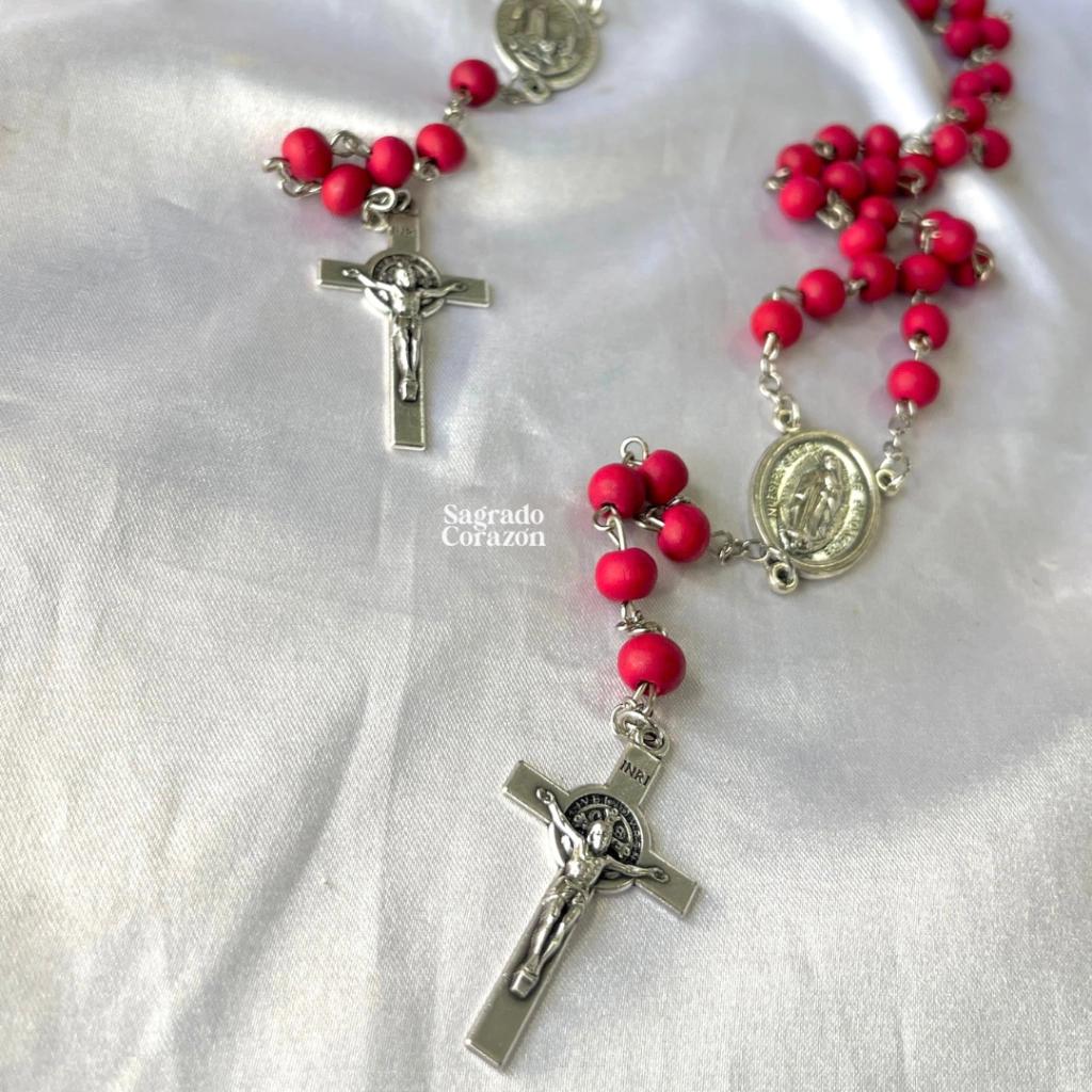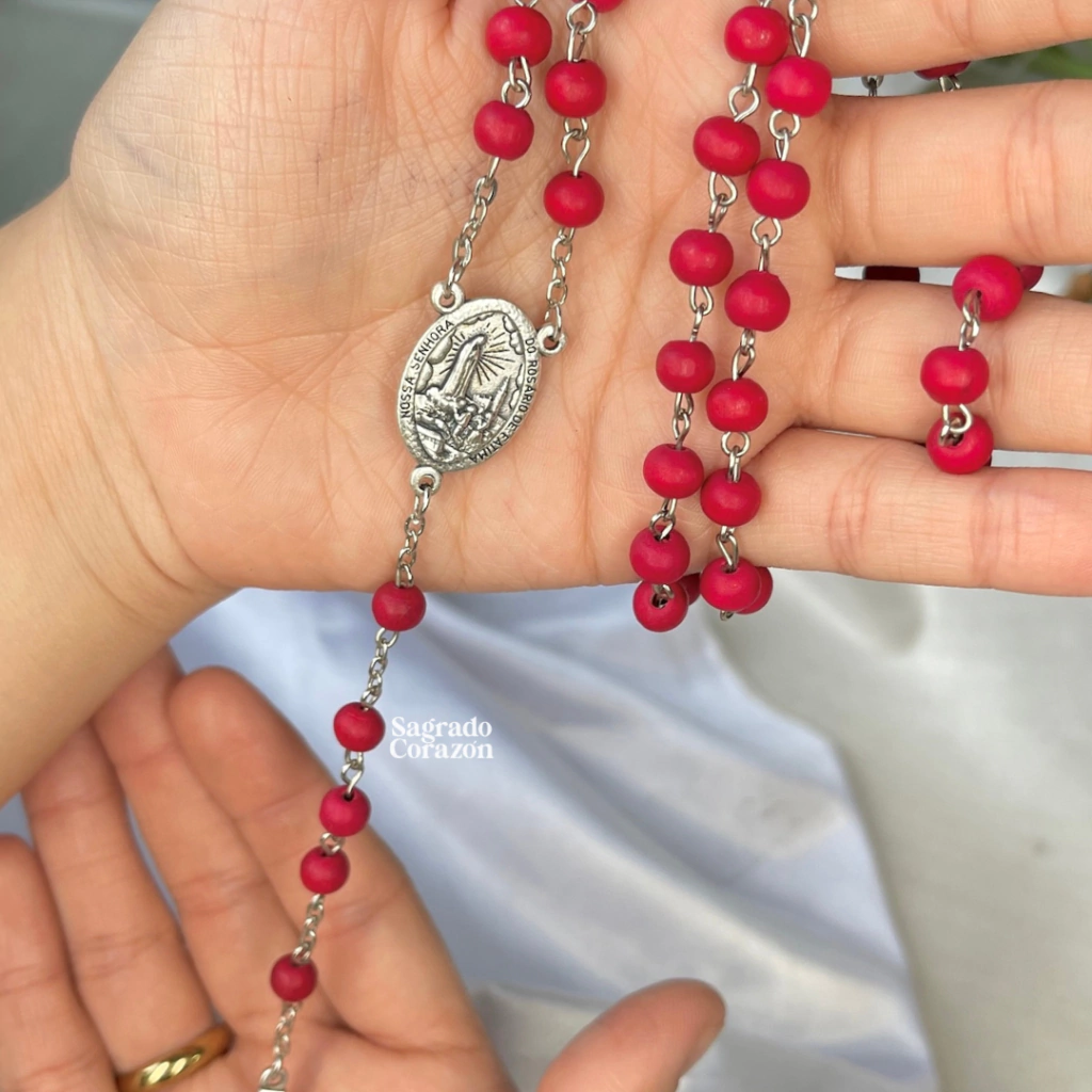 Camandula en madera color rojo, olor a rosas. El crucero lo puedes elegir entre la Virgen de Fátima o Milagrosa.